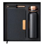Set para regalo que incluye 1 bolígrafo, 1 libreta y 1 botella. Presentación en caja negra de lujo con interior de cuna EVA negro.