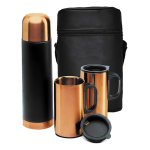 Set de termo y mugs electro plateados en color cobre dentro de bolso-estuche negro de tela raquelada. Presentación en caja de cartón negra.