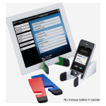 Soporte plástico abatible para iPad y Celular, con goma antideslizante en ambos terminales. Tamaño: 13.4 x 4 x 0.5 cm (cerrado).