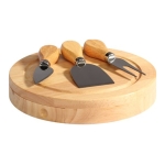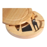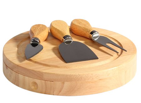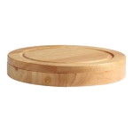 Tabla redonda retráctil de madera sólida de ROBLE, con canaleta circular. Contiene 3 herramientas para cortar y servir Quesos, en compartimento inferior retráctil. Madera trabajada y acabada en máquina, de forma 100% regular, con superficies y cantos lisos y suaves, para una mayor higiene y comodidad al momento de cortar y servir los quesos.D19 x 3 cm. aprox.