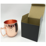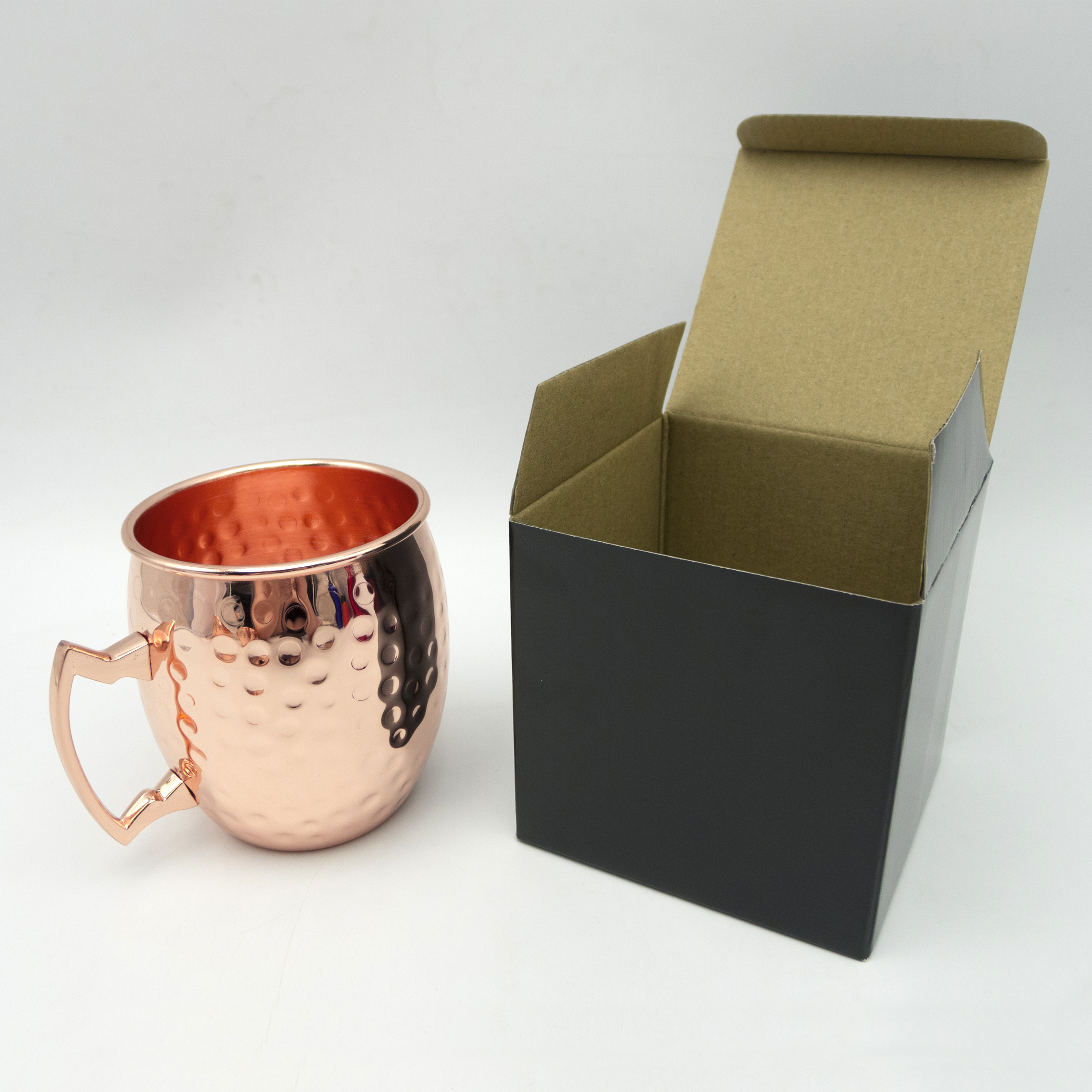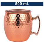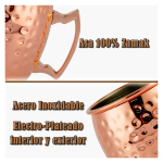 Mug de acero inoxidable electro plateado en cobre con puntos martillados y asa de Zamak. Cobre en interior y exterior. Capacidad de 500 ml. Presentación en plástico burbuja dentro de caja de negra.