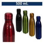 Botella thermo de acero inoxidable con forma de botella en distintos colores. Capacidad de 500ml. Incluye silicona antiderrame. Presentación en caja de cartón negra. Caja de 30 unidades.