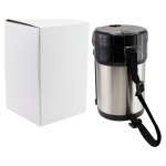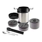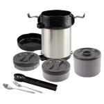 Termo de Acero inoxidable de 2 litros, con 3 compartimentos plásticos interiores independientes. Ideal para mantener alimentos tibios por más tiempo, para el almuerzo o la colación escolar. Incluye juego de cubiertos metálicos (tenedor y cuchara pequeños) en contenedor plástico negro. Presentación en estuche de cartón blanco.