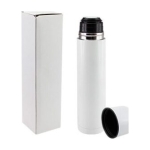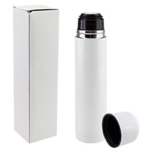 Termo de Acero inoxidable de 1 litro, cubierto en pintura epóxica blanca, tapa con dosificador. Presentación en estuche de cartón blanco.