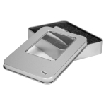 Mug térmico de acero inoxidable de doble pared aislante con tapa plástica negra y dosificador. Con conector USB y al cenicero del automóvil. Presentación en caja de cartón plateado.