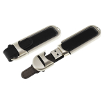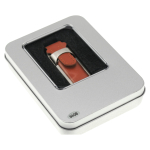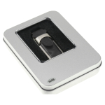 USB Pendrive memoria de 64GB, de cuero. Presentación en elegante estuche de aluminio con ventana, dentro de cuna de esponja EVA negra.