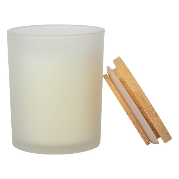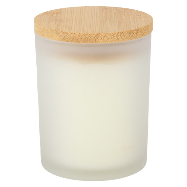 Vela aromática de 8oz en envase redondo de vidrio empavonado con tapa de Bamboo. Aroma a Vainilla. Ideal para regalo de hogar y aromaterapia. Amplia superficie de impresión de logo.