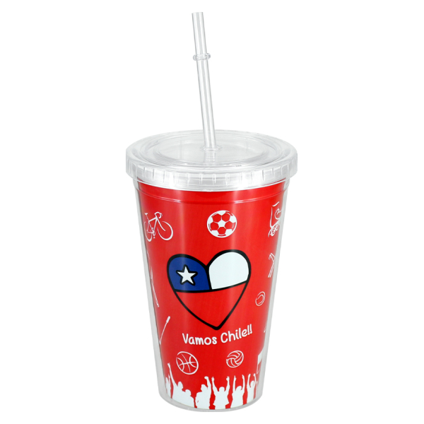Vamos chilenos!!! A alentar a la roja.  Vaso plástico transparente con gráfica interior «Vamos Chile». Incluye tapa rosca y bombilla